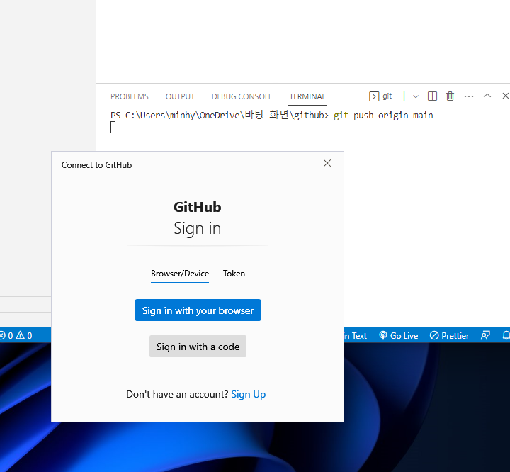git push origin main 을 작성하면 아래와 같이 다시 sign in하라는 팝업이 뜸