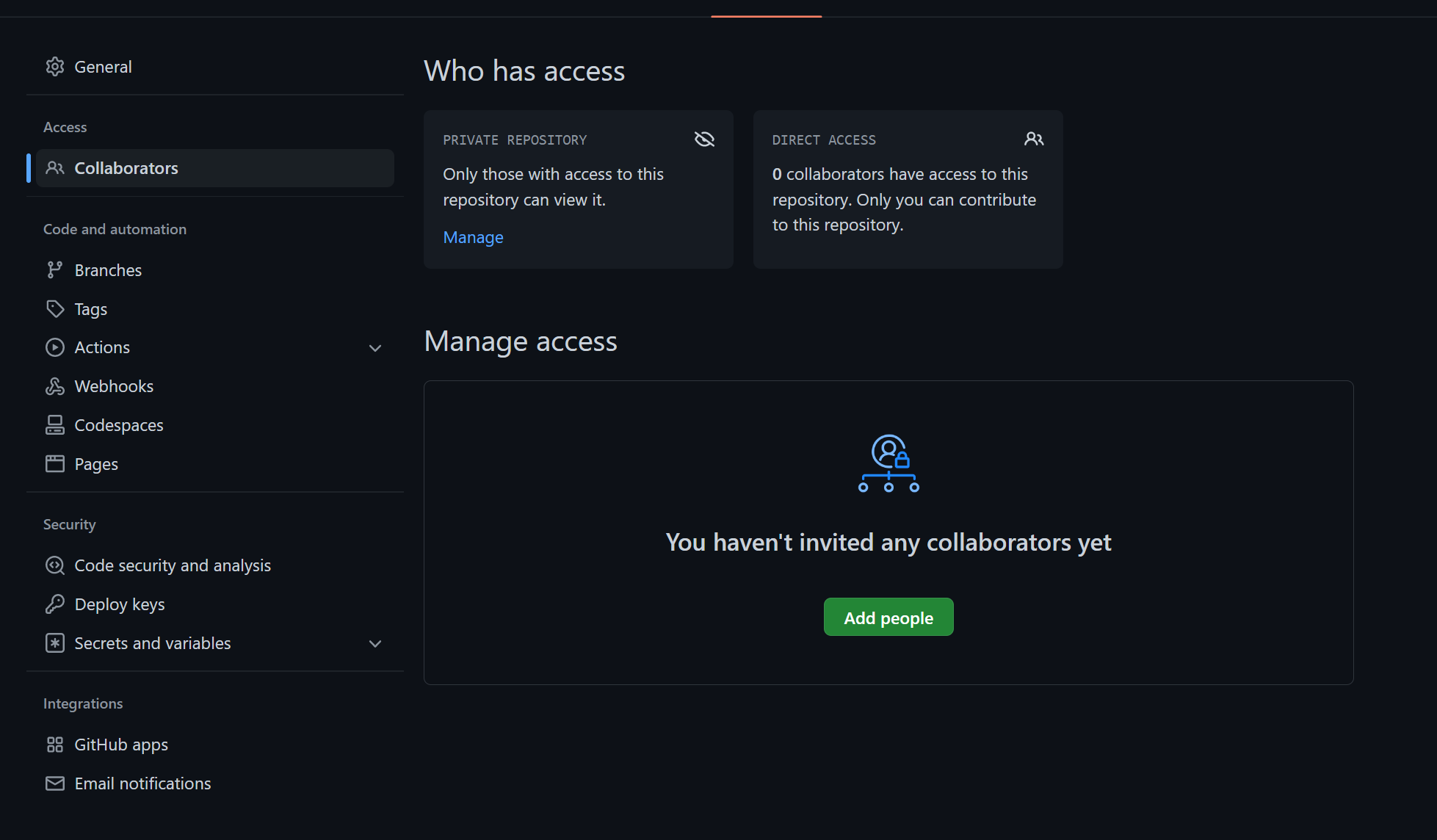 깃허브의 collaboratiors 메뉴에서 add people을 통해 초대장을 보내게 된다
